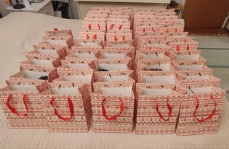 Joulukuussa 2025 lahjoitimme vähävaraisille lapsiperheille 46 lahjakassia, jotka sisälsivät 50euron lahjakortin ruokakauppaan sekä jäsenten kutomia villasukkia.