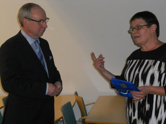 ![]() Juhlan kunniavieras oli Matti Toivola, jota TerveysMartat muistivat marttojen esiliinalla. Kuvassa myös Mervi Wallin. |